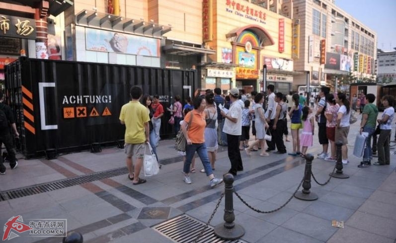 一周之后,這臺集裝箱突然現(xiàn)身在北京王府井步行街,箱體上的兩個觀察孔引來了過往游客的圍觀,甚至一度影響到步行街的交通——長長的隊伍幾乎橫穿了寬闊的王府井大街。